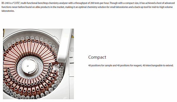 Mindray BS-240 is a “CUTE”, multi-functional benchtop chemistry analyzer with a throughput of 200 tests per hour. Though with a compact size, it has achieved a host of advanced functions never before found on alike products in the market, making it an optimal chemistry solution for small laboratories and a back-up tool for mid-to-high volume laboratories.
