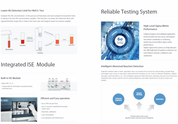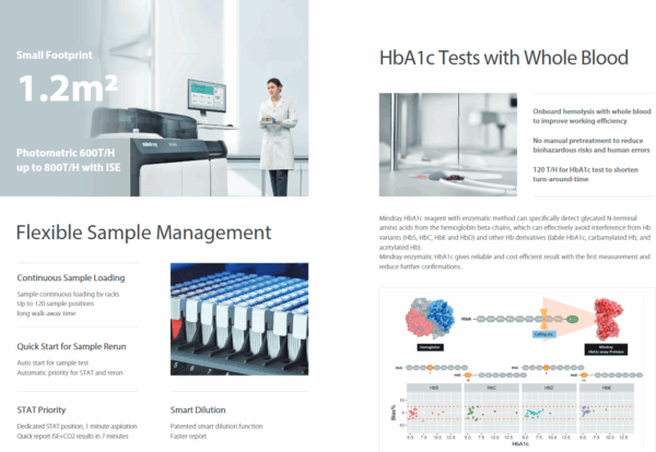 BS-600M is a high-throughput, compact chemistry analyzer designed for medium-sized laboratories, offering increased productivity and efficiency. It features continuous sample loading, STAT sample priority, and a robotic sample handler for streamlined workflow. The system also includes whole-blood HbA1c testing and an integrated ISE module, delivering reliable results with excellent sigma metrics.