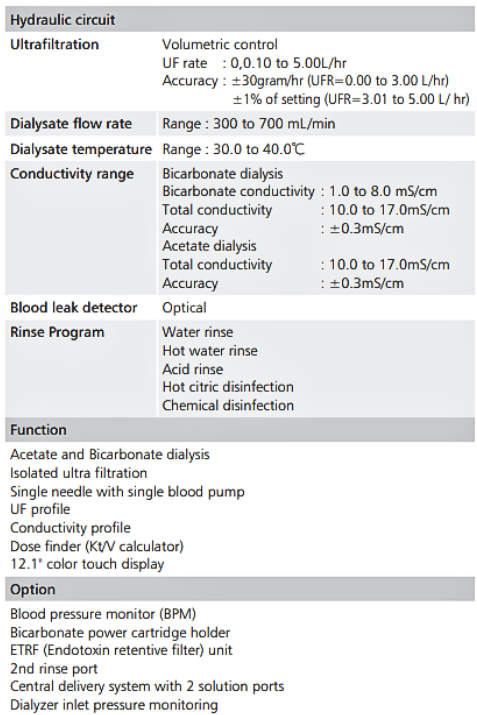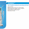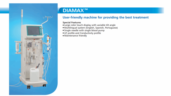 Nipro DIAMAX is a dialysis machine designed for treating patients with acute or chronic kidney failure. It is used to filter a patient's blood, removing excess water and waste products when the kidneys are unable to perform these functions. The DIAMAX is specifically mentioned as being applicable for single patient use in dialysis treatments.